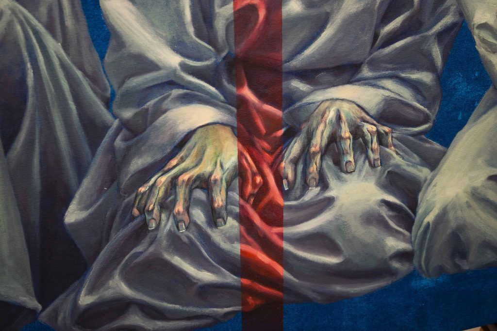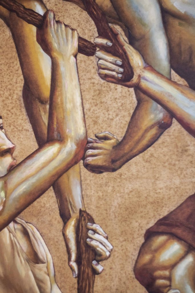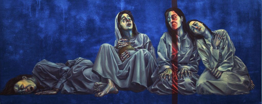 The painting shows two sides of the war story, or one that is divided into two contrasting halves of one story, fighting, cruelty and terrorism, and the other side passion, pain and loss due to the war.